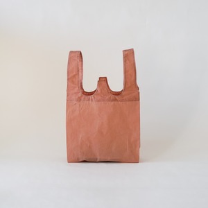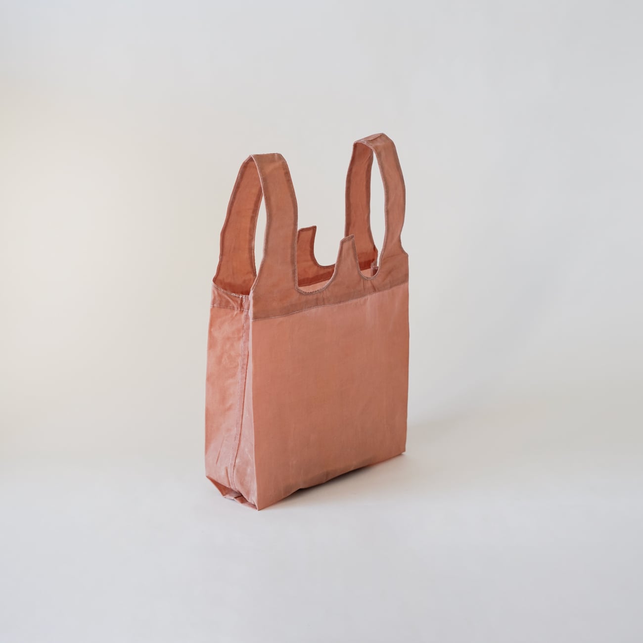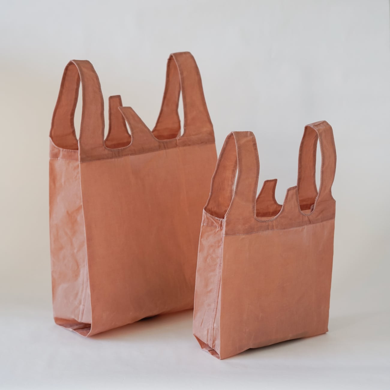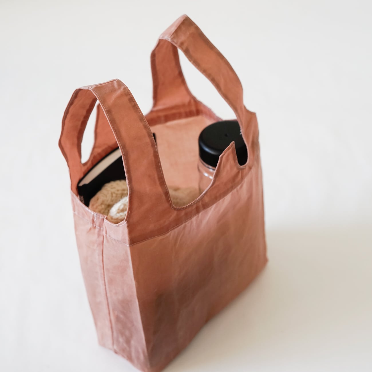 古くから親しまれてきた草木染めの色を、現代の暮らしに合うモダンなデザインのエコバッグに仕立てました。ロウを引くことで、撥水性と耐久性も加わり、ながくお使いいただけるレジ袋タイプのエコバッグです。初めは紙のようなハリがあり硬い手触りですが、使い込むほどに柔らかく馴染み、折れシワが生まれ風合いが増していきます。