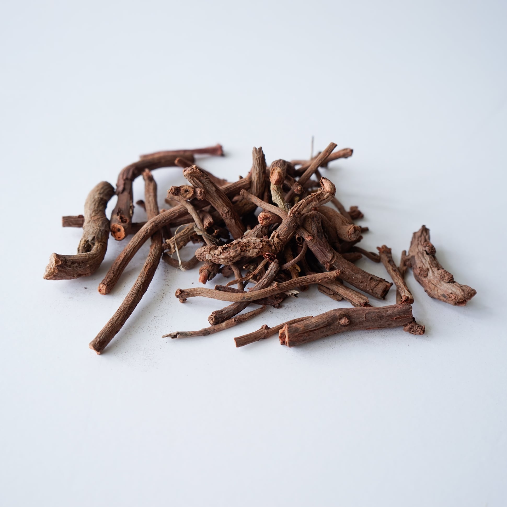 山野に自生するアカネ科のつる性の多年草です。「赤い根」から「あかね」に転じたそう。太いひげ状の根を煮出し、古くから染料や薬としても用いられてきました。