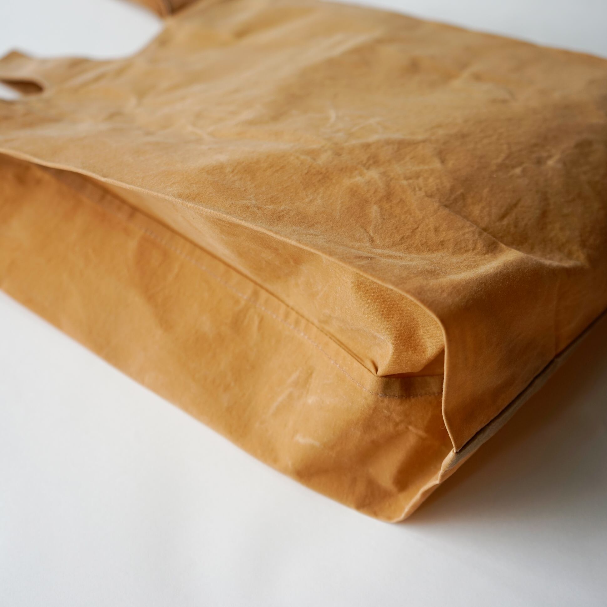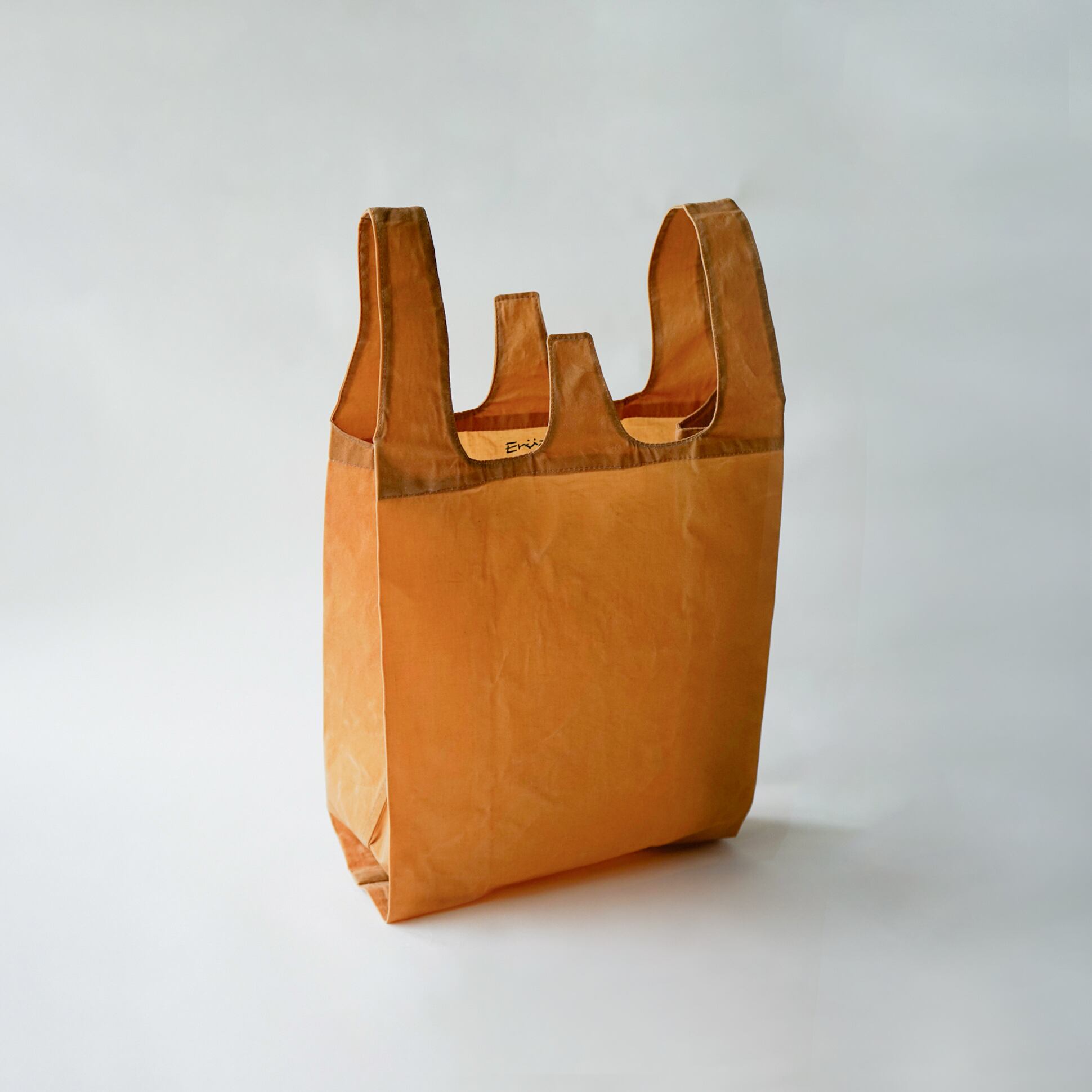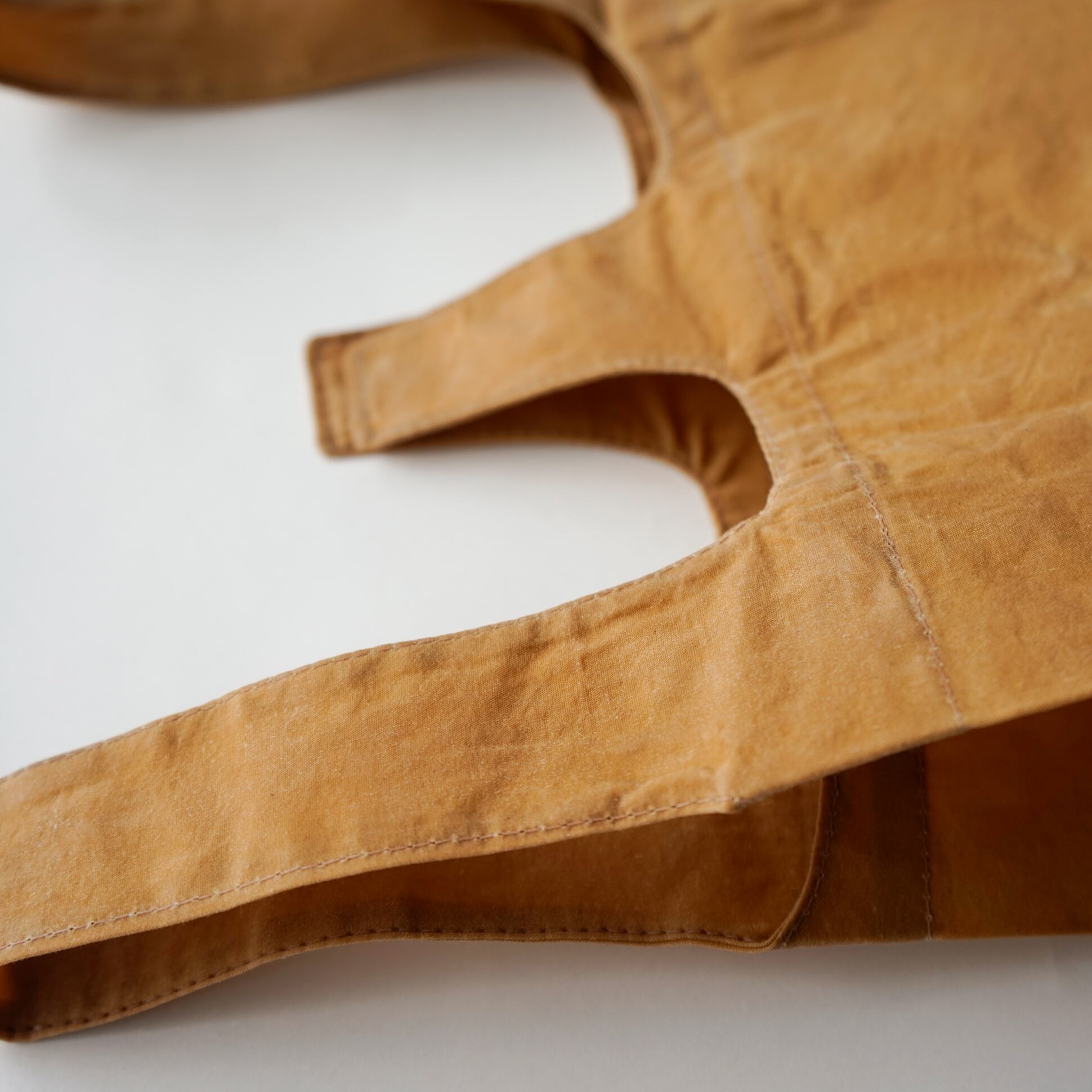 カテキューで染めた、レジ袋タイプのバック。使い勝手の良さはそのまま残し、ながく使えるよう作りました。ロウを引くことで、撥水性と耐久性も加わり、初めは紙のような硬さのある手触りですが、使い込んでいく内に表情を変え柔らかくなじんできます。