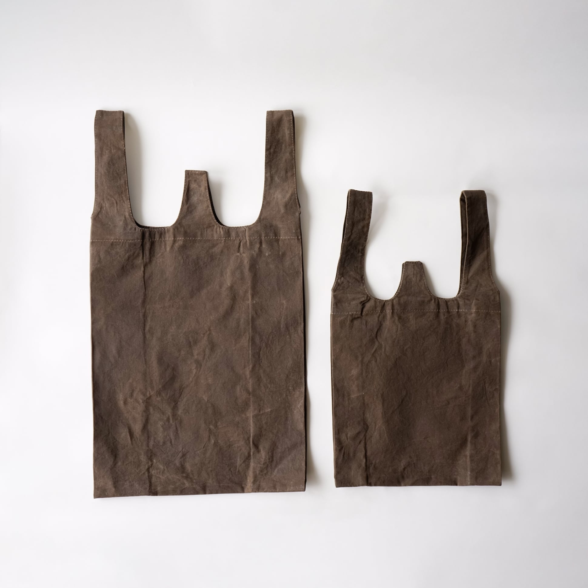 カテキューで染めた、レジ袋タイプのバックのミニサイズ。ちょっとしたお出かけなどにちょうど良い大きさです。ロウを引くことで、撥水性と耐久性も加わり、初めは紙のような硬さのある手触りですが、使い込んでいく内に表情を変え柔らかくなじんできます。